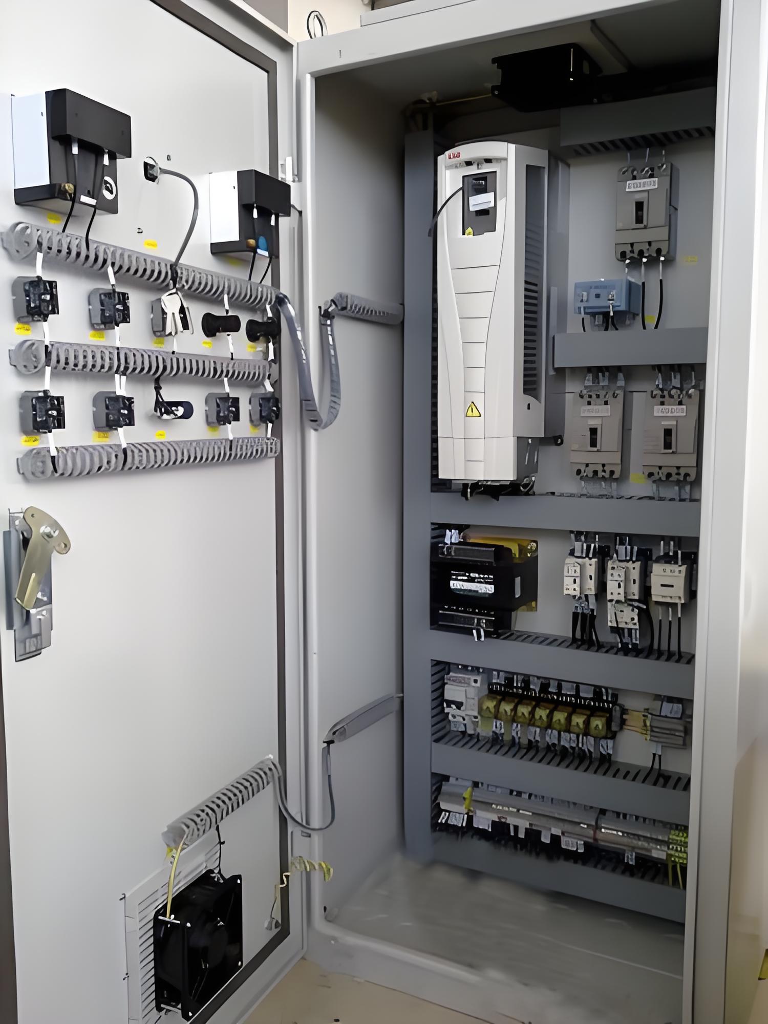 某项目PLC配电柜由配电柜由可控制器、变频器、仪表、熔断器、接触器、继电器及一些低压电器元件所组合而。 电气工程师根据用户要求对该PLC柜进行设计、细节描述、画图后经双方确认,所有元器件应按制造厂规定的安装条件进行安装,对产品型号、元器件型号、规格、数量等是否与图纸相符,并确保元器件无损坏,确保满足适用条件,由我公司工作人员从采购到组装而完成。